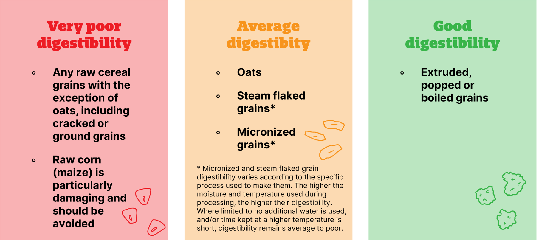 Poorly digested grain, even at moderate intakes, pushes starch into the hindgut and increases risk of acidosis, leaky gut and laminitis.